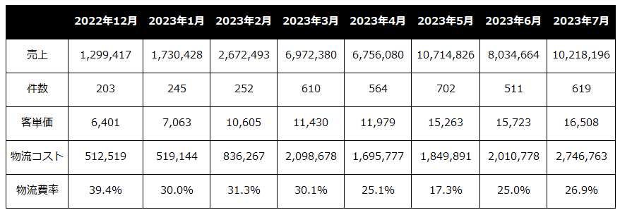 月商1000万を到達する中で物流コスト比率は運営初期と比べ、改善し約17.3%~26.9%の間を推移する結果となりました。