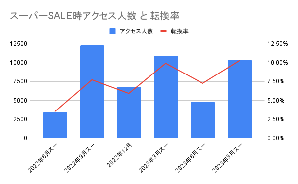 今回の検証により、二重価格でセール時に安価な価格で販売している期間の方が転換率が高くスーパーSALEサーチ掲載することによりアクセス人数も多く獲得できる結果となりました。