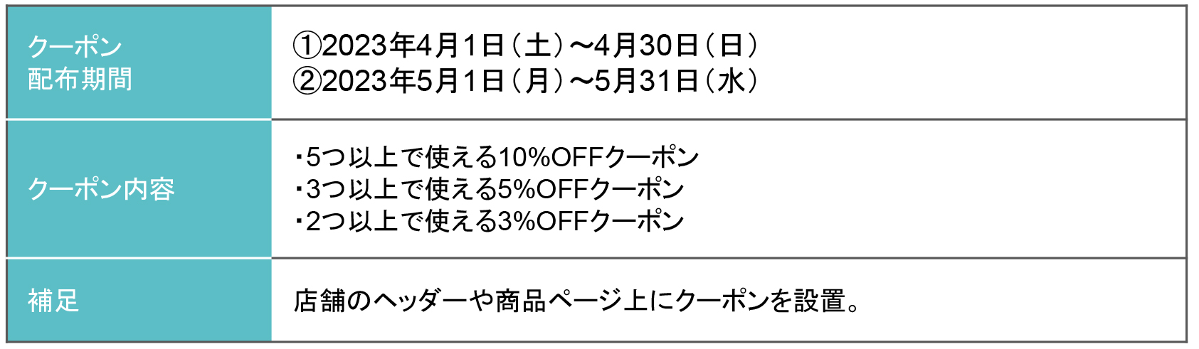店舗のヘッダーや商品ページなど、ひと月通して店舗内の目立つ場所に設置したクーポンと比較してクーポン利用率や店舗の転換率に違いが出るかを検証する。