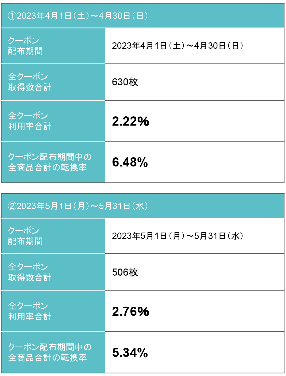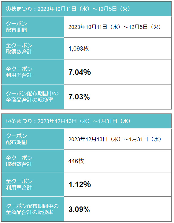 店舗内のヘッダーや商品ページ上など目立つところに設置したクーポンと比較して、特集ページ限定のシークレットクーポンを作成して特集ページ内に設置した①「秋まつり」のクーポンのほうが利用率が約5%程高くなった。クーポン配布期間中の全商品合計の転換率についてもやや高くなっている。しかし②の「冬まつり」については利用率・クーポン配布期間中の転換率ともに低い結果となっている。
