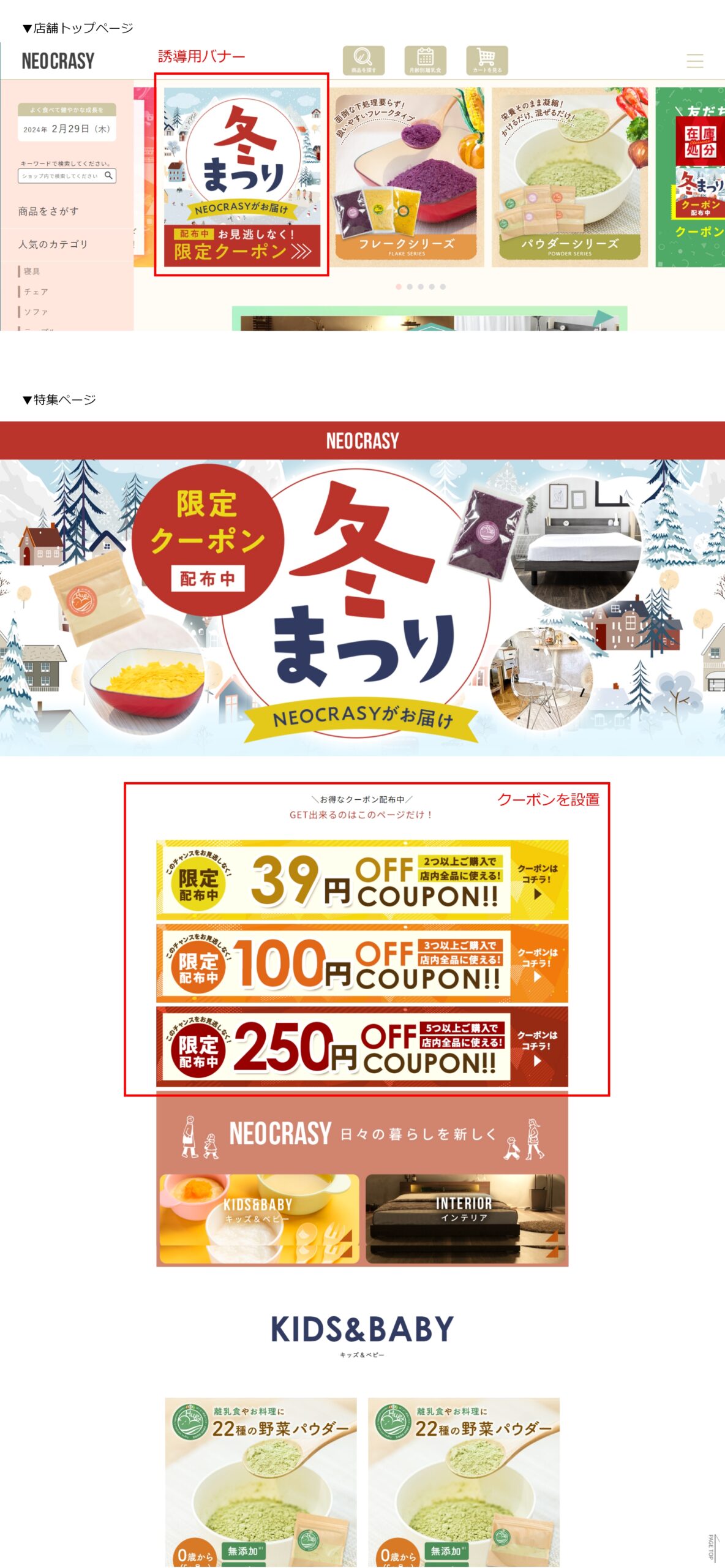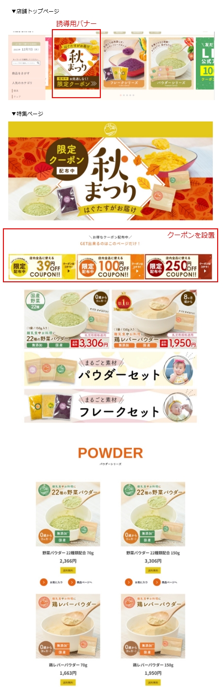 特集ページ限定のシークレットクーポンを作成し、「秋まつり」「冬まつり」の特集ページに設置。