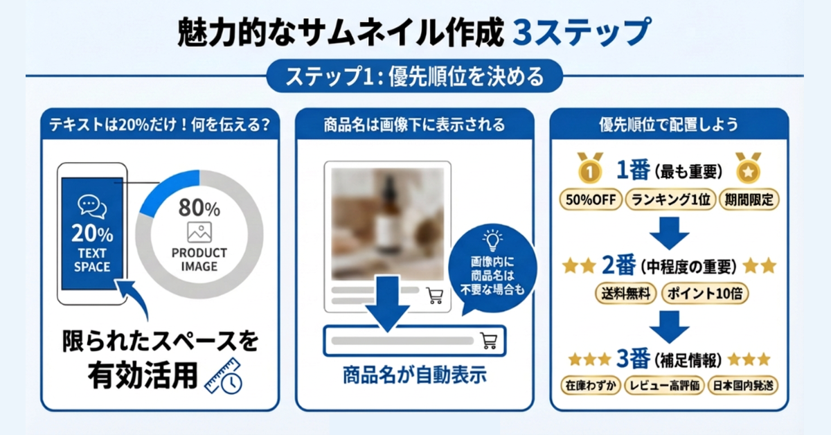 ガイドラインに違反すると違反点数が付き店舗の評価が下がります。そのため、ルールを守りつつしっかりと商品の魅力を伝えられるサムネイル作りが必須となるのです。今回は3つのステップに沿って「思わずクリックしてしまう」サムネイルを作成していきましょう。