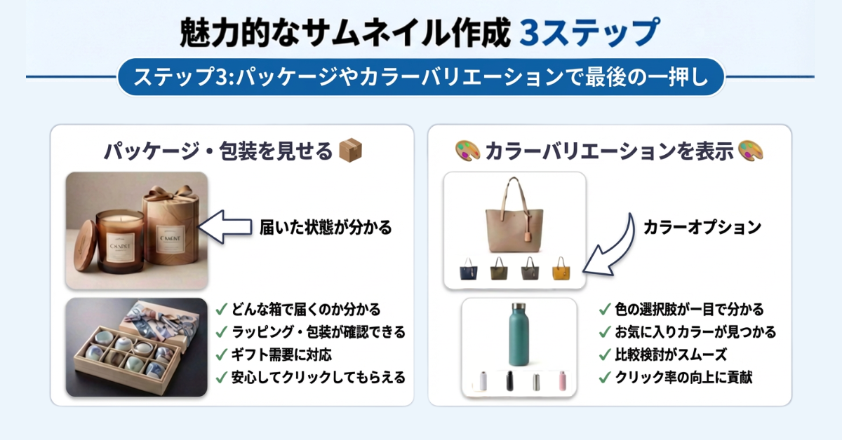これまでの2ステップで、サムネイルの完成度はすでに完璧に近い状態です。そこへさらに最後の一押しとして加えるのが、「パッケージ」「カラーバリエーション」です。中身の写真だけでなくパッケージや包装を入れることにより、その商品がどのような状態で手元に届くのかを視覚的にユーザーへ伝えます。特に前述のギフトでは、どんな箱で届くのか?リボンや包装紙でラッピングしてもらえるのか?など、気になりますよね。そういった不安を取り除き、安心してクリックしてもらうための大事な要素なのです。また、色のバリエーションが複数ある場合は必ず掲載しましょう。メインイメージとして使っている商品の色をユーザーが気に入らなかった場合も、色違いがあると分かればクリックしてもらえる可能性が格段に増します。パッケージやカラーバリエーションの合成についてはガイドライン違反に当たらず、テキスト占有率にも影響しません。(※)安心して足せる要素なので、ぜひ活用してください。