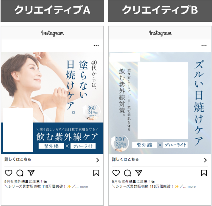 B:「ズルい日焼けケア」という表現でターゲット訴求は強めず、日焼けに対してのアプローチがメインのクリエイティブ