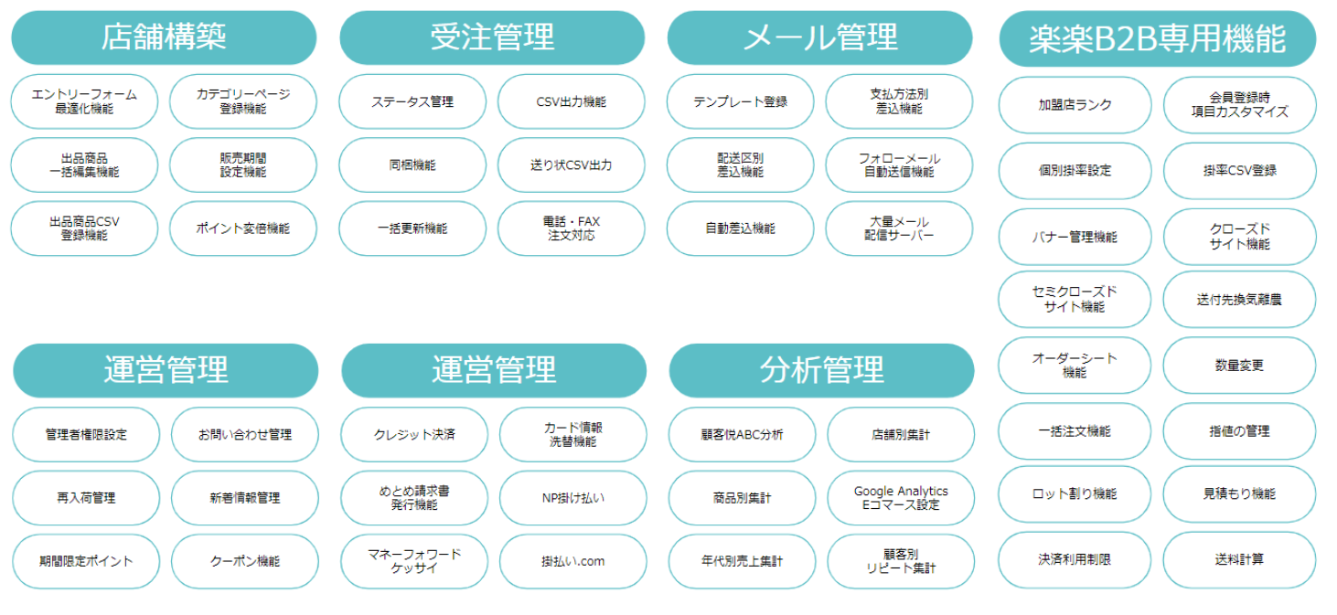 基本機能に加えて、営業支援の機能や売上UP機能など。セキュリティ対策や決済方法の充実、連携サービスの幅広さも嬉しいポイントです。
