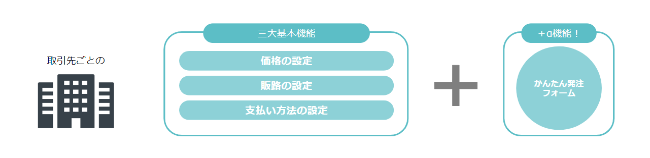 その基本機能が【価格の設定】【販路の設定】【支払い方法の設定】でございます。この機能だけでなく、デジタルが苦手な人やご年配の方でも簡単に注文ができる画面遷移やマウス操作を最大限シンプルにした「かんたん発注フォーム」や、見積機能を搭載しております。帳票類の作成が取引先で作成・出力可能になり、取引先や注文毎の販売条件も自動反映可能です。