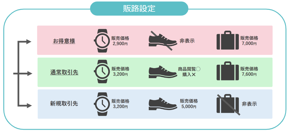 「A社には◯◯を販売したいけれど、B社には▲▲だけを販売したい」といった自社の状況に合わせた表示の設定が自由自在です。これにより、取引先ごとに異なる商品のラインナップを効果的に管理し、最適な提案ができます。