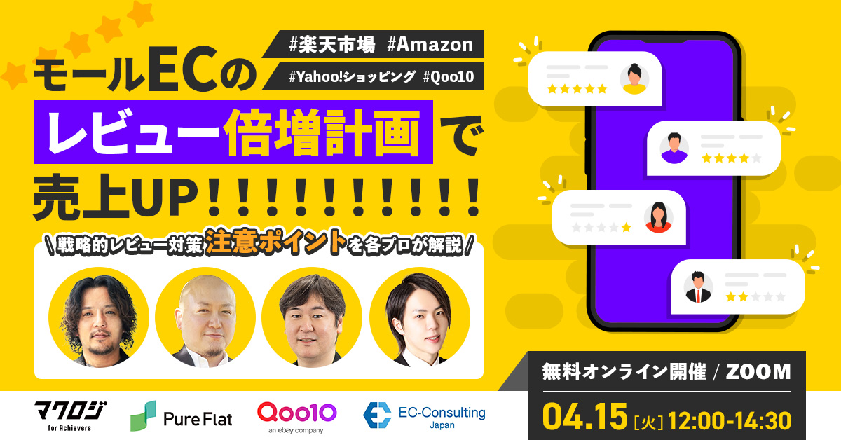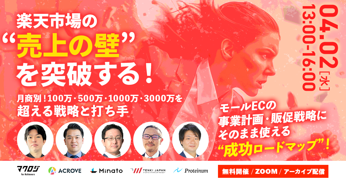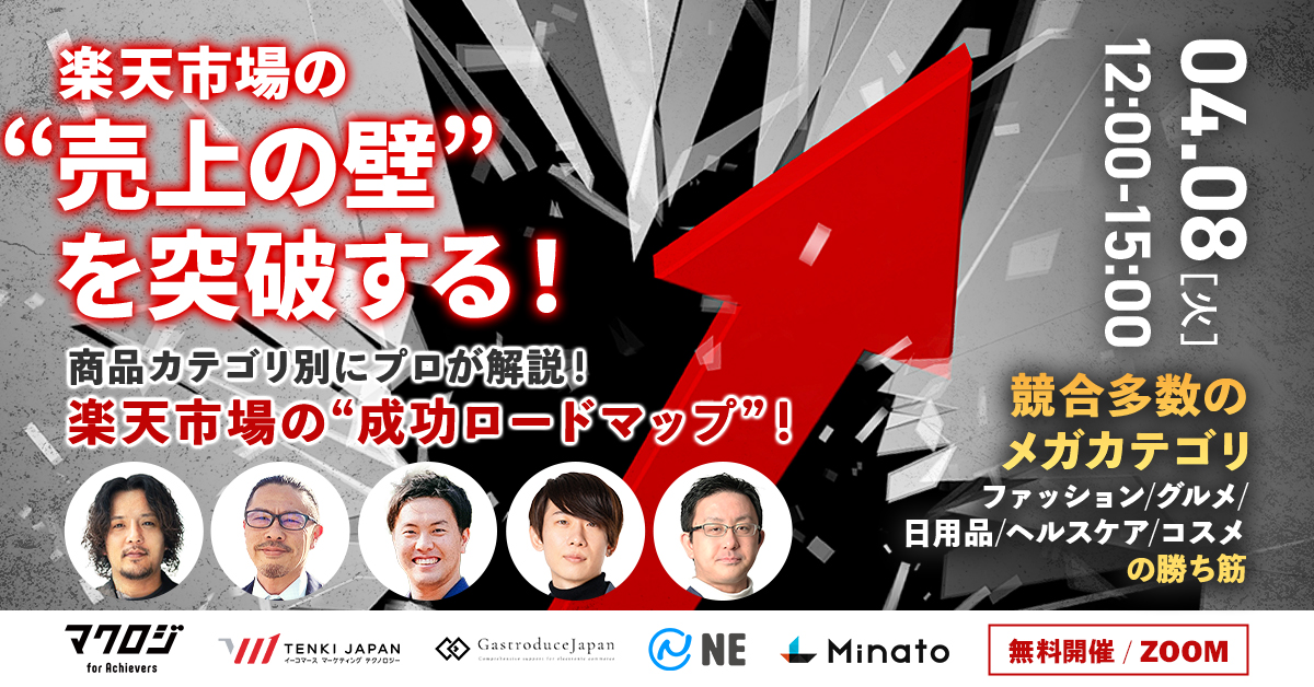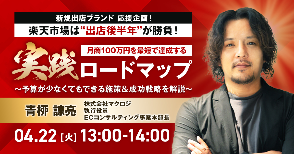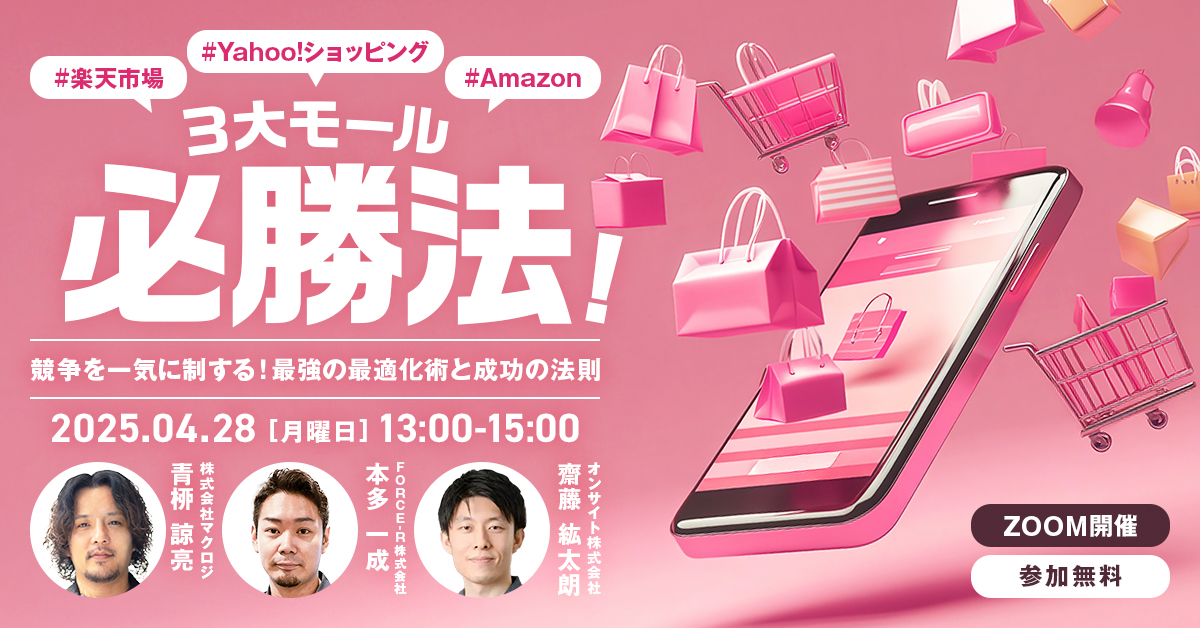 受付終了楽天市場自社EC初めてのEC集客ノウハウ 楽天市場は“出店後半年”が勝負!月商100万円を最短で達成する実践ロードマップ~予算が少なくてもできる施策&成功戦略を解説~ 開催日 2025年4月22日 (火) 13:00 開催場所 オンライン開催(ZOOM) 受付終了楽天市場AmazonYahoo!ショッピング自社EC初めてのEC集客ノウハウ 3大モール必勝法!競争を一気に制する!最強の最適化術と成功の法則 開催日 2025年4月28日 (月) 13:00 開催場所 オンライン開催(ZOOM) 受付終了楽天市場AmazonD2CSNSマーケティングデザイン自社EC初めてのEC広告運用集客ノウハウ ECの売上は、クリエイティブの力で決まる!~顧客に選ばれるモール・サイトデザイン・LP・SNS・CRMまで一挙公開~ 開催日 2025年4月24日 (木) 12:00 開催場所 オンライン開催(ZOOM) 受付終了楽天市場Amazon自社EC初めてのEC集客ノウハウ 2025年最新EC売上アップ戦略~成功事例で学ぶモール・SNS・LPの勝ち筋とは?~ 開催日 2025年4月23日 (水) 16:00 開催場所 トレードピアお台場(東京都) 受付終了楽天市場AmazonYahoo!ショッピングQoo10自社EC初めてのEC集客ノウハウ モールECの“レビュー倍増計画”で売上UP!#楽天市場#Amazon#Yahoo!ショッピング#Qoo10 開催日 2025年4月15日 (火) 12:00 開催場所 オンライン開催(ZOOM) 受付終了Amazon自社EC初めてのEC集客ノウハウ 60分で攻略!はじめての出品〜売上を伸ばすために抑えるべきポイントとは?〜 開催日 2025年4月09日 (水) 13:00 開催場所 オンライン開催(ZOOM) 受付終了楽天市場自社EC初めてのEC集客ノウハウ 楽天市場の“売上の壁”を突破する!~競合多数のメガカテゴリ、“ファッション・グルメ・日用品・ヘルスケア・コスメ”の勝ち筋~ 開催日 2025年4月08日 (火) 12:00 開催場所 オンライン開催(ZOOM) 受付終了楽天市場AmazonSEO自社EC初めてのEC広告運用集客ノウハウ 楽天vsAmazon新規獲得を最大化する集客施策を徹底比較!~セール対策・広告・SEO対策~ 開催日 2025年4月03日 (Thu) 00:00 開催場所 オンライン開催(ZOOM) 受付終了アーカイブ配信楽天市場AmazonSEO自社EC初めてのEC広告運用集客ノウハウ 【アーカイブ配信】楽天vsAmazon新規獲得を最大化する集客施策を徹底比較!~セール対策・広告・SEO対策~ 開催日 2025年5月09日 (金) 12:00 開催場所 【アーカイブ配信】オンライン開催(ZOOM) 受付終了アーカイブ配信楽天市場自社EC初めてのEC広告運用集客ノウハウ 【アーカイブ配信】楽天市場の“売上の壁”を突破する!~月商別!100万・500万・1000万・3000万を超える戦略と打ち手~ 開催日 2025年4月02日 (Wed) 00:00 開催場所 【アーカイブ配信】オンライン開催(ZOOM)