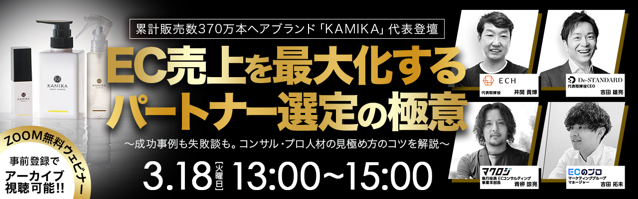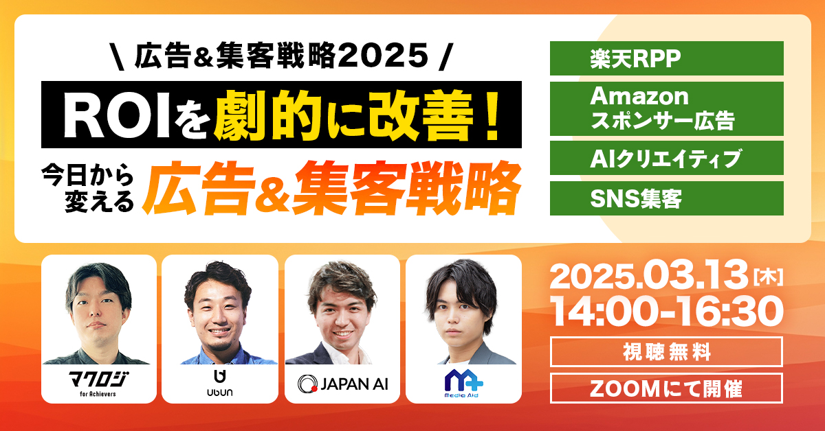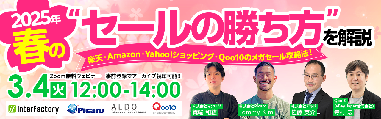受付終了楽天市場AmazonQoo10越境EC美容・コスメSNSマーケティング自社EC初めてのEC広告運用集客ノウハウ 認知拡大・売上アップ施策BEST20~激戦市場を勝ち抜く、ヒットブランド・商品の創り方~ 開催日 2025年3月27日 (木) 10:00 開催場所 オンライン開催(ZOOM) 受付終了楽天市場AmazonYahoo!ショッピングauPAYモール自社EC初めてのEC 2025年楽天攻略の勝ち筋&事業戦略書の事例~モールEC市場における自社商品のSWOT分析のやり方~ 開催日 2025年3月19日 (水) 11:00 開催場所 オンライン開催(ZOOM) 受付終了楽天市場AmazonYahoo!ショッピングauPAYモール自社EC初めてのEC 2025年楽天攻略の勝ち筋&事業戦略書の事例~モールEC市場における自社商品のSWOT分析のやり方~ 開催日 2025年3月28日 (金) 11:00 開催場所 オンライン開催(ZOOM) 受付終了楽天市場Amazon自社EC初めてのEC集客ノウハウ モールEC売上を最大化する“パートナー”選定の極意〜コンサル先・業務委託人材の見極め方のコツを解説~ 開催日 2025年3月18日 (火) 13:00 開催場所 オンライン開催(ZOOM) 受付終了楽天市場AmazonYahoo!ショッピングauPAYモール自社EC初めてのEC 2025年楽天攻略の勝ち筋&事業戦略書の事例~モールEC市場における自社商品のSWOT分析のやり方~ 開催日 2025年3月13日 (木) 11:00 開催場所 オンライン開催(ZOOM) 受付終了楽天市場AmazonSNSマーケティング自社EC初めてのEC広告運用集客ノウハウ ROIを劇的に改善!今日から変える“広告&集客”戦略~楽天RPP・Amazonスポンサー広告・AIクリエイティブ・SNS集客の最適解~ 開催日 2025年3月13日 (木) 14:00 開催場所 オンライン開催(ZOOM) 受付終了アーカイブ配信楽天市場Amazon自社EC初めてのEC集客ノウハウ 【アーカイブ配信】楽天 vs Amazon vs 自社EC2025年の「売れるECサイト」はこれだ! 開催日 2025年4月17日 (木) 12:00 開催場所 【アーカイブ配信】オンライン開催(ZOOM) 受付終了楽天市場Amazon自社EC初めてのEC集客ノウハウ 楽天 vs Amazon vs 自社EC2025年の「売れるECサイト」はこれだ! 開催日 2025年3月11日 (火) 12:00 開催場所 オンライン開催(ZOOM) 受付終了楽天市場AmazonYahoo!ショッピングauPAYモール自社EC初めてのEC 2025年楽天攻略の勝ち筋&事業戦略書の事例~モールEC市場における自社商品のSWOT分析のやり方~ 開催日 2025年3月06日 (木) 12:00 開催場所 オンライン開催(ZOOM) 受付終了楽天市場AmazonYahoo!ショッピングQoo10広告運用集客ノウハウ 2025年春の“セールの勝ち方”を解説 開催日 2025年3月04日 (火) 12:00