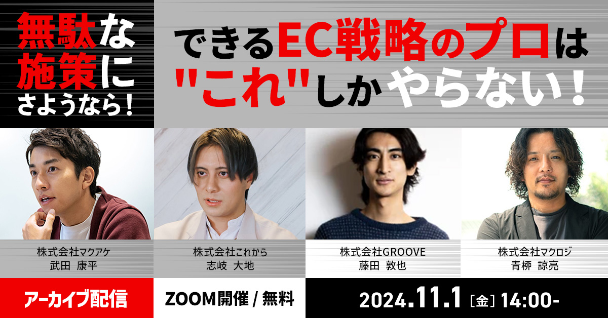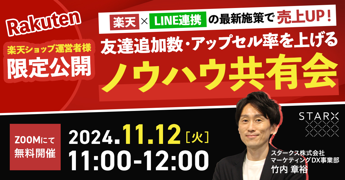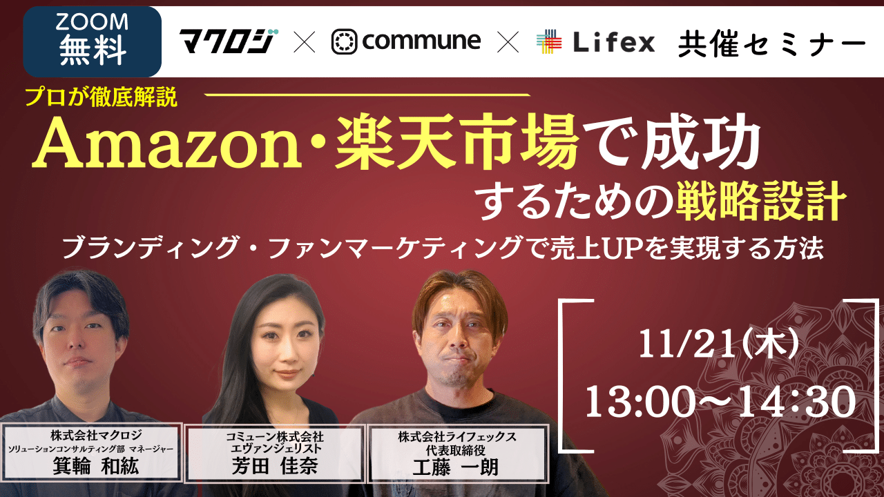受付終了楽天市場Amazon集客ノウハウ Amazon・楽天市場で成功するための戦略設計~ブランディング・ファンマーケティングで売上UPを実現する方法~ 開催日 2024年11月21日 (木) 13:00 開催場所 オンライン開催(ZOOM) 受付終了25年1月24年12月楽天市場AmazonYahoo!ショッピングSNSマーケティング自社EC初めてのEC広告運用集客ノウハウ 【期間限定アーカイブ配信】オンラインカンファレンス2024 RAKUTEN_THE_DAY ノウハウ大還元祭 開催日 2024年12月23日 (月) 10:00 開催場所 期間限定【アーカイブ配信】 受付終了24年12月AmazonSNSマーケティング自社EC初めてのEC集客ノウハウ 【アーカイブ配信】ECサミットvol.3〜アパレル業界編〜激戦のファッション・アパレル業界で「選ばれるEC」になるための鉄板戦略・必須施策を学べる1日 開催日 2024年12月02日 (月) 00:00 開催場所 期間限定【アーカイブ配信】 受付終了楽天市場AmazonYahoo!ショッピングD2C自社EC初めてのEC集客ノウハウ 購買サイクルを強化!リピートを生むECバリューチェーンの秘訣 開催日 2024年11月15日 (金) 14:00 開催場所 オンライン開催(ZOOM) 受付終了楽天市場D2CSNSマーケティング集客ノウハウ 楽天×LINE連携の最新施策で売上UP!~友達追加数・アップセル率を上げるノウハウ共有会~ 開催日 2024年11月12日 (火) 11:00 開催場所 オンライン開催(ZOOM) 受付終了Amazon集客ノウハウ Amazon HACK~年末商戦で差をつける必勝施策→Amazonビジネス活用法までまるっと解説~ 開催日 2024年11月06日 (水) 13:00 開催場所 オンライン開催(ZOOM) 受付終了楽天市場AmazonD2C自社EC初めてのEC集客ノウハウ できるEC戦略のプロは”これ”しかやらない! 開催日 2024年11月01日 (金) 14:00 開催場所 オンライン開催(ZOOM) 受付終了楽天市場AmazonYahoo!ショッピングD2C美容・コスメSNSマーケティング自社EC初めてのEC広告運用集客ノウハウ ECサミットvol.2~美容・化粧品業界編~ 開催日 2024年10月28日 (月) 11:00 開催場所 オンライン開催(ZOOM) 受付終了SNSマーケティング初めてのEC集客ノウハウ \見込み顧客醸成と新規顧客の獲得戦略/SNS×コミュニケーション戦略の最先端 開催日 2024年10月25日 (金) 14:00 開催場所 オンライン開催(ZOOM) 受付終了楽天市場初めてのEC集客ノウハウ 楽天ショップオブザイヤ―を獲得する企業の組織体制とKPI設計とは? 開催日 2024年10月21日 (月) 09:00 開催場所 オンライン開催(ZOOM)