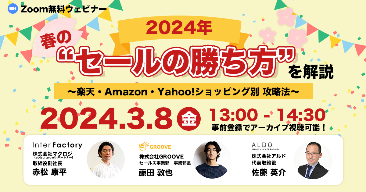 受付終了楽天市場AmazonYahoo!ショッピングSEOSNSマーケティング自社EC初めてのEC集客ノウハウ EC×SEO対策大全2024 開催日 2024年4月03日 (水) 14:00 開催場所 オンライン開催(ZOOM) 受付終了Amazon自社EC初めてのEC広告運用集客ノウハウ Amazonビジネスから始めるBtoB EC~2024年EC売上を一気に上げるグロース戦略&成功事例~ 開催日 2024年3月05日 (火) 14:00 受付終了楽天市場AmazonYahoo!ショッピング 2024年春の”セールの勝ち方”を解説〜楽天・Amazon・Yahoo!ショッピング別攻略法〜 開催日 2024年3月08日 (金) 13:00 受付終了楽天市場AmazonYahoo!ショッピングD2C自社EC初めてのEC広告運用 SNS戦略2024 開催日 2024年3月13日 (水) 13:00 開催場所 オンライン開催(ZOOM) 受付終了楽天市場Amazon初めてのEC集客ノウハウ 楽天vsAmazon〜自社商品の勝ち筋となるモールECはどっち!?〜 開催日 2024年3月12日 (火) 14:00 開催場所 オンライン開催(ZOOM) 受付終了楽天市場AmazonYahoo!ショッピングD2CSNSマーケティング自社EC初めてのEC集客ノウハウ 「モールEC」vs「広告運用」vs「SNS」新規獲得の費用対効果が良い施策はこれだ! 開催日 2024年2月27日 (火) 14:00 開催場所 オンライン開催(ZOOM) 受付終了楽天市場Amazon自社EC初めてのEC集客ノウハウ 2024年“売れるECサイト”はこれだ!~成功事例・データ分析をベースにプロが解説~【アーカイブ配信】 開催日 2024年4月24日 (水) 00:00 開催場所 オンライン開催(ZOOM) 受付終了楽天市場AmazonYahoo!ショッピング自社EC初めてのEC 売上100億を目指すビッグデータ活用&分析術 開催日 2024年2月13日 (火) 13:00 開催場所 オンライン開催(ZOOM) 受付終了楽天市場Qoo10SNSマーケティング自社EC初めてのEC集客ノウハウ 楽天・Qoo10・Instagramで売上アップ&LTVを上げるVOC~2024年最新Tipsと事例紹介~分析 開催日 2024年2月02日 (金) 14:00 開催場所 オンライン開催(ZOOM) 受付終了楽天市場AmazonYahoo!ショッピングD2C自社EC初めてのEC広告運用集客ノウハウ 自社EC・モールECの売上アップ術2024最新トレンド 開催日 2024年1月30日 (火) 14:00 開催場所 オンライン開催(ZOOM)