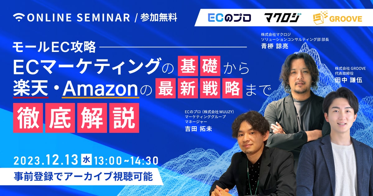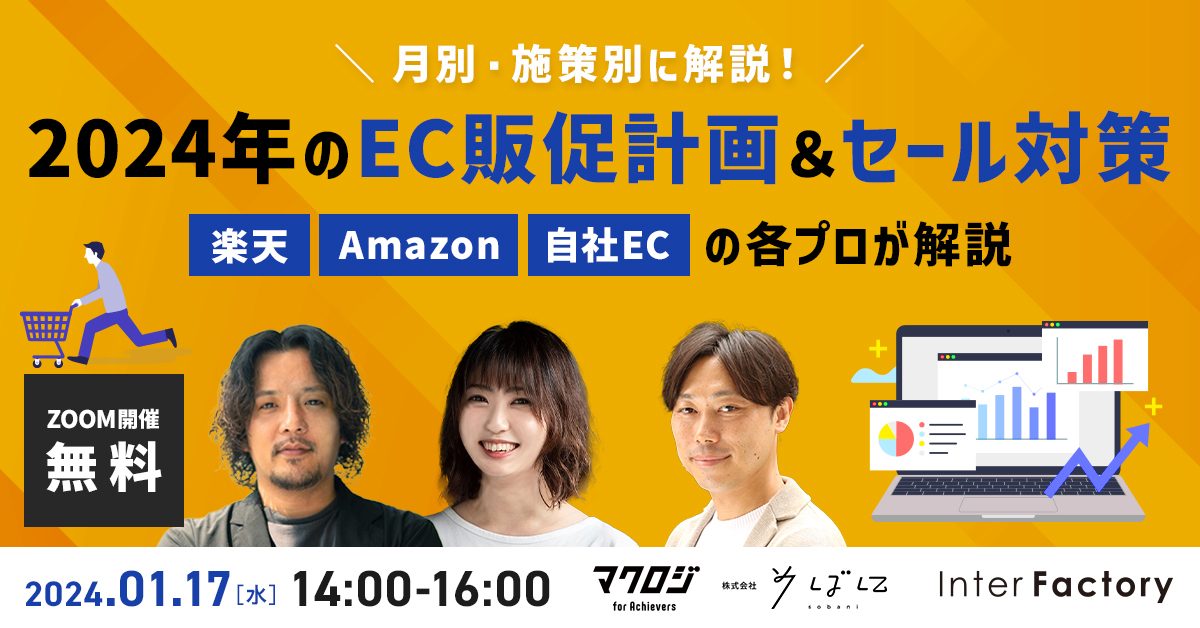 受付終了楽天市場AmazonYahoo!ショッピングD2C自社EC初めてのEC集客ノウハウ 月商3億以上を作る!自社ブランドを持つ4社が“EC成功の秘訣・ロードマップ”を大公開! 開催日 2024年1月23日 (火) 13:00 開催場所 オンライン開催(ZOOM) 受付終了楽天市場Amazonデザイン自社EC初めてのEC広告運用集客ノウハウ 【楽天】vs【Amazon】vs【自社EC】 2024年「売れるECサイト」はこれだ! 開催日 2024年1月18日 (木) 14:00 開催場所 オンライン開催(ZOOM) 受付終了楽天市場Amazon自社EC初めてのEC集客ノウハウ 2024年のEC販促計画&セール対策~楽天・Amazon・自社ECの各プロが解説~ 開催日 2024年1月17日 (水) 14:00 開催場所 オンライン開催(ZOOM) 受付終了楽天市場Amazonオフライン自社EC初めてのEC集客ノウハウ 食品ECの売上アップ術徹底解説~楽天・Amazon・オフライン・CRM〜 開催日 2023年12月21日 (木) 14:00 開催場所 オンライン開催(ZOOM) 受付終了楽天市場Amazonアリババ 2024年の国内EC・越境EC販促戦略 開催日 2023年12月19日 (火) 14:00 開催場所 オンライン開催(ZOOM) 受付終了 DX化における『勝ち抜ける』組織作り 開催日 2023年12月15日 (金) 14:00 開催場所 オンライン開催 受付終了楽天市場AmazonD2C自社EC初めてのEC集客ノウハウ ECマーケティングの基礎から楽天・Amazonの最新戦略まで徹底解説 開催日 2023年12月13日 (水) 13:00 開催場所 オンライン開催(ZOOM) 受付終了楽天市場AmazonYahoo!ショッピングQoo10auPAYモールD2CSNSマーケティング自社EC初めてのEC集客ノウハウ 2024年に向けて、知っておきたい最新のEC情報 開催日 2023年12月12日 (火) 10:00 開催場所 オンライン開催(ZOOM) 受付終了楽天市場AmazonYahoo!ショッピングauPAYモールD2CSNSマーケティング自社EC初めてのEC集客ノウハウ 集客手法が聞ける1日 開催日 2023年12月06日 (水) 10:00 開催場所 オンライン開催(ZOOM) 受付終了楽天市場D2CSNSマーケティング自社EC初めてのEC集客ノウハウ オンラインプレゼンスを売上へ変える 戦略的アプローチ法とは? 開催日 2023年11月29日 (水) 13:00 開催場所 オンライン開催(ZOOM)