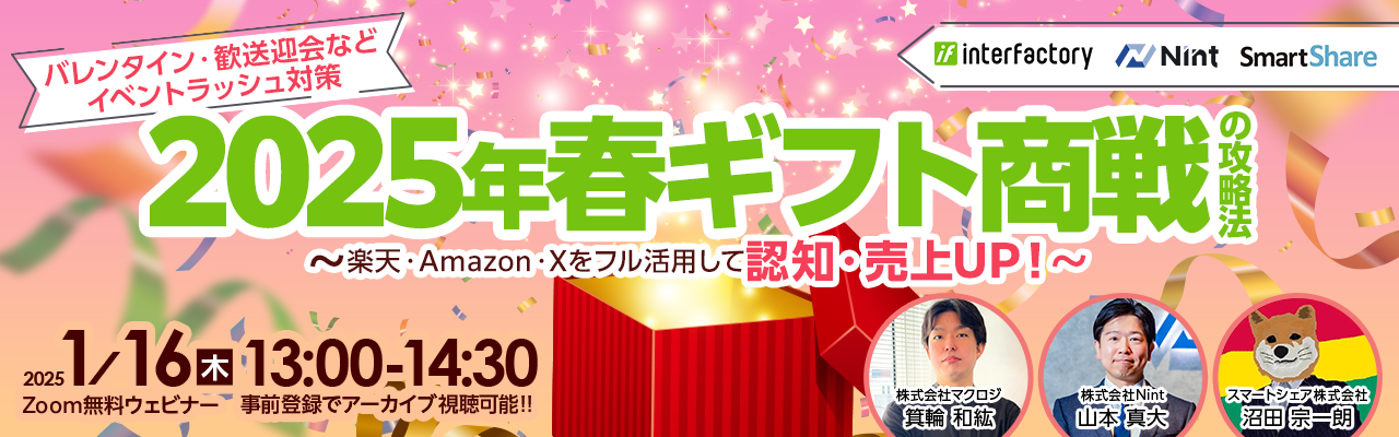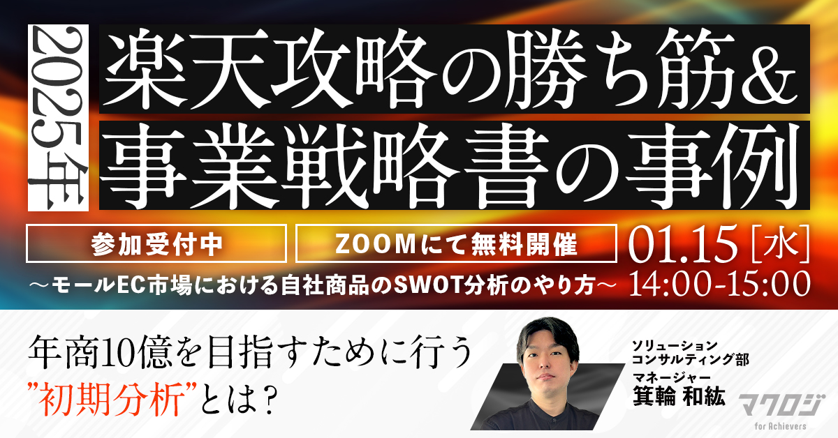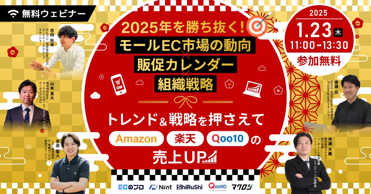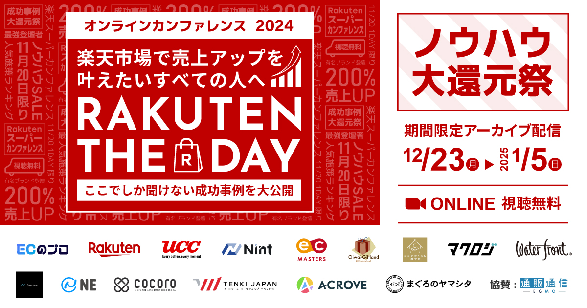受付終了25年1月楽天市場AmazonYahoo!ショッピングQoo10越境ECアリババ自社EC初めてのEC 2025年注力すべきネットショップはどこ?~自社EC・楽天・Amazon・Yahoo!ショッピング/LINE・TEMU/越境~ 開催日 2025年1月21日 (火) 13:00 ~ 開催場所 【アーカイブ配信】 受付終了25年1月楽天市場AmazonYahoo!ショッピングQoo10D2CSEO自社EC初めてのEC広告運用集客ノウハウ E-1グランプリ2025 開催日 2025年1月29日 (水) 11:00 ~ 開催場所 オンライン開催(ZOOM) 受付終了25年1月楽天市場AmazonQoo10自社EC初めてのEC 「モールEC市場の動向×販促カレンダー×組織戦略」完全ガイド~トレンド&戦略を押さえてAmazon・楽天・Qoo10の売上UP~ 開催日 2025年1月23日 (木) 11:00 ~ 開催場所 オンライン開催(ZOOM) 受付終了25年1月楽天市場AmazonYahoo!ショッピングSNSマーケティング集客ノウハウ “2025年春ギフト商戦”の攻略法~楽天・Amazon・Xをフル活用して認知・売上UP!~ 開催日 2025年1月16日 (木) 13:00 ~ 開催場所 オンライン開催(ZOOM) 受付終了25年1月楽天市場AmazonYahoo!ショッピングauPAYモール自社EC初めてのEC 2025年楽天攻略の勝ち筋&事業戦略書の事例~モールEC市場における自社商品のSWOT分析のやり方~ 開催日 2025年1月15日 (水) 14:00 ~ 開催場所 オンライン開催(ZOOM) 受付終了25年1月SNSマーケティング集客ノウハウ Instagram運用の基本と最新のアルゴリズム 開催日 2025年1月29日 (水) 15:00 ~ 開催場所 オンライン開催(ZOOM) 受付終了25年1月24年12月楽天市場AmazonSNSマーケティング自社EC初めてのEC広告運用集客ノウハウ プロが教える正しいEC戦略&売上UPの具体策~EC初心者向けの基礎から実践~ 開催日 2025年1月09日 (木) 13:00 ~ 開催場所 オンライン開催(ZOOM) 受付終了25年1月24年12月楽天市場AmazonYahoo!ショッピングSNSマーケティング自社EC初めてのEC広告運用集客ノウハウ 【期間限定アーカイブ配信】オンラインカンファレンス2024 RAKUTEN_THE_DAY ノウハウ大還元祭 開催日 2024年12月23日 (月) 10:00 ~ 開催場所 期間限定【アーカイブ配信】